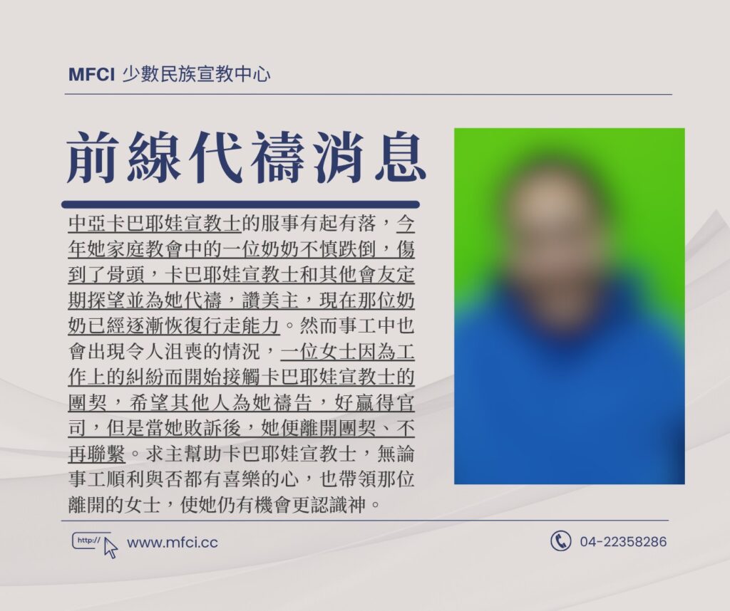 前線代禱消息 為中亞卡巴耶娃宣教士 中亞卡巴耶娃宣教士的服事有起有落,今年她家庭教會中的一位奶奶不慎跌倒,傷到了骨頭,卡巴耶娃宣教士和其他會友定期探望並為她代禱,讚美主,現在那位奶奶已經逐漸恢復行走能力。然而事工中也會出現令人沮喪的情況,一位女士因為工作上的糾紛而開始接觸卡巴耶娃宣教士的團契,希望其他人為她禱告,好贏得官司,但是當她敗訴後,她便離開團契、不再聯繫。求主幫助卡巴耶娃宣教士,無論事工順利與否都有喜樂的心,也帶領那位離開的女士,使她仍有機會更認識神。