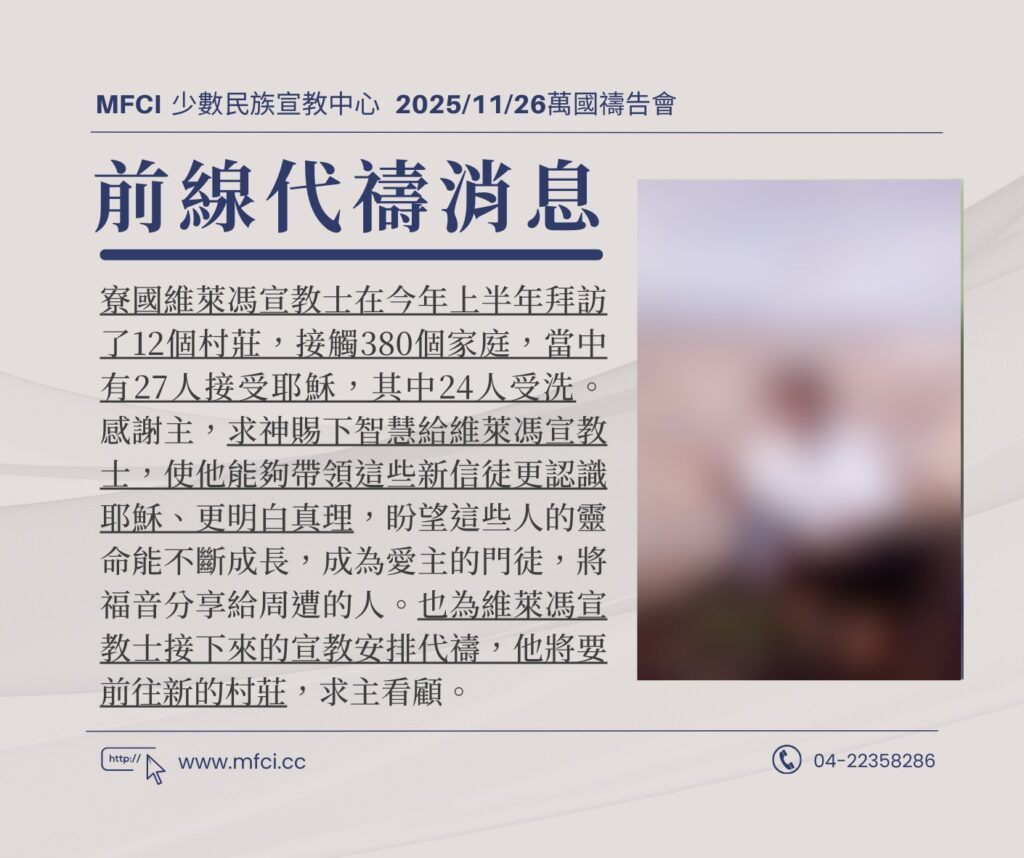 寮國維萊馮宣教士在今年上半年拜訪了12個村莊,接觸380個家庭,當中有27人接受耶穌,其中24人受洗。感謝主,..