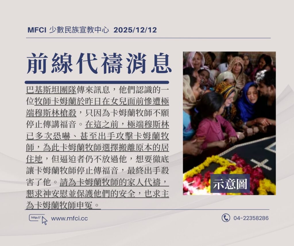 巴基斯坦團隊傳來訊息,他們認識的一位牧師卡姆蘭於昨日在女兒面前慘遭極端穆斯林槍殺,只因為卡姆蘭牧師不願停止傳講..