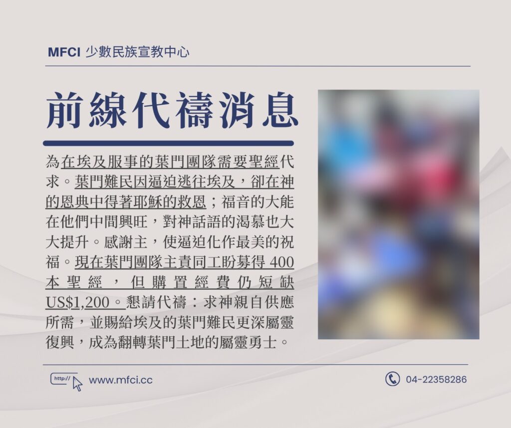 為在埃及服事的葉門團隊需要聖經代求。葉門難民因逼迫逃往埃及,卻在神的恩典中得著耶穌的救恩;福音的大能在他們中間..