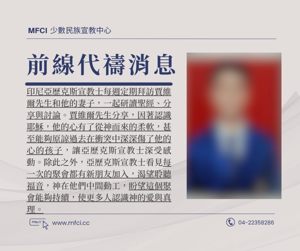 印尼亞歷克斯宣教士每週定期拜訪賈維爾先生和他的妻子,一起研讀聖經、分享與討論。賈維爾先生分享,因著認識耶穌,他..