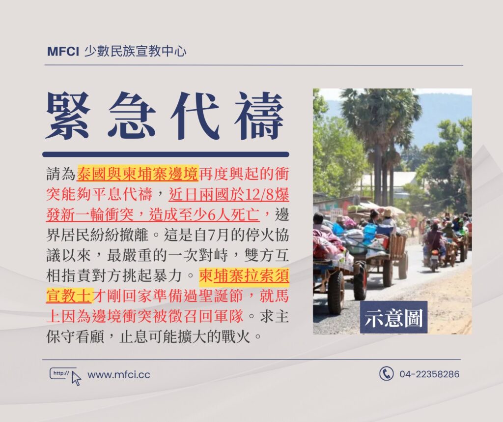 請為泰國與柬埔寨邊境再度興起的衝突能夠平息代禱,近日兩國於12/8爆發新一輪衝突,造成至少6人死亡,邊界居民紛..