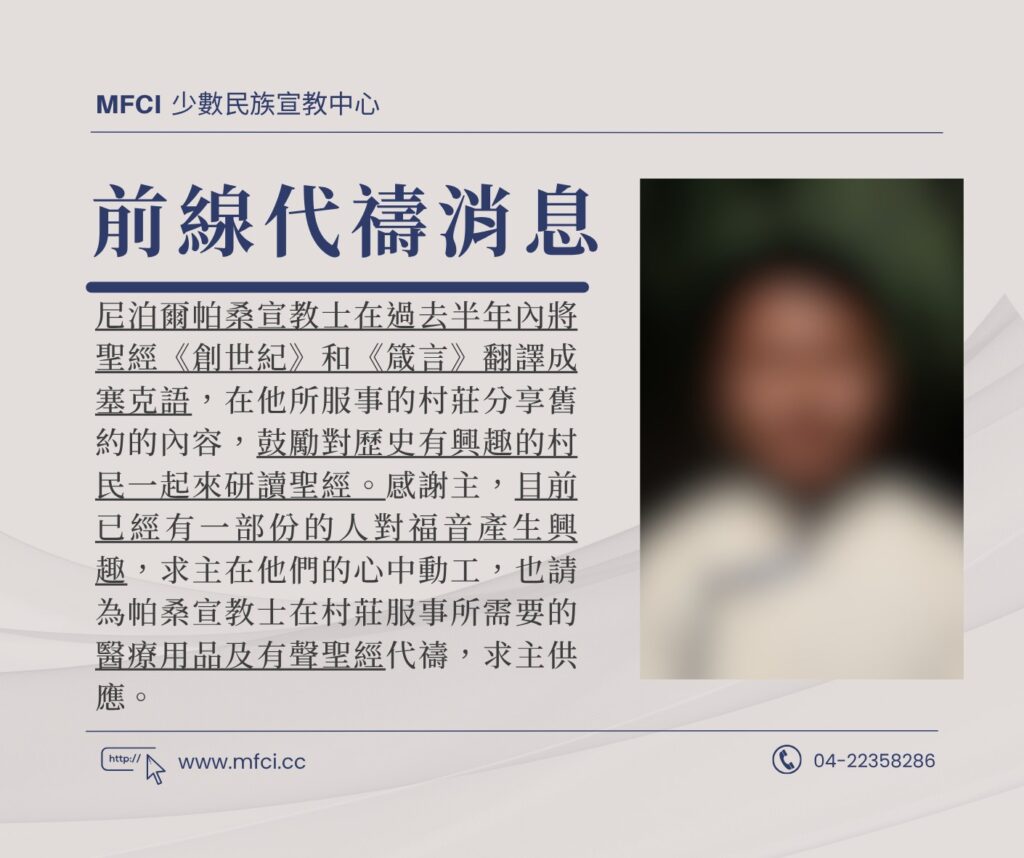尼泊爾帕桑宣教士在過去半年內將聖經《創世紀》和《箴言》翻譯成塞克語,在他所服事的村莊分享舊約的內容,鼓勵對歷史..