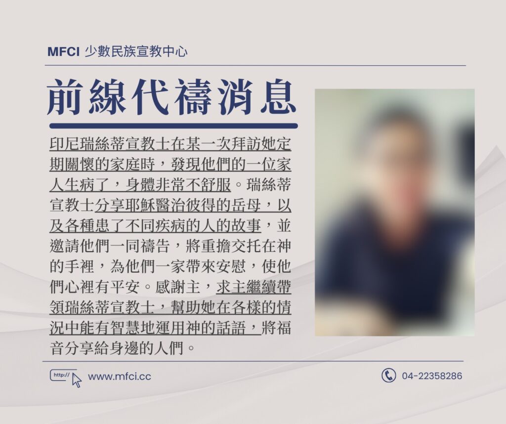 印尼瑞絲蒂宣教士在某一次拜訪她定期關懷的家庭時,發現他們的一位家人生病了,身體非常不舒服。瑞絲蒂宣教士分享耶穌..