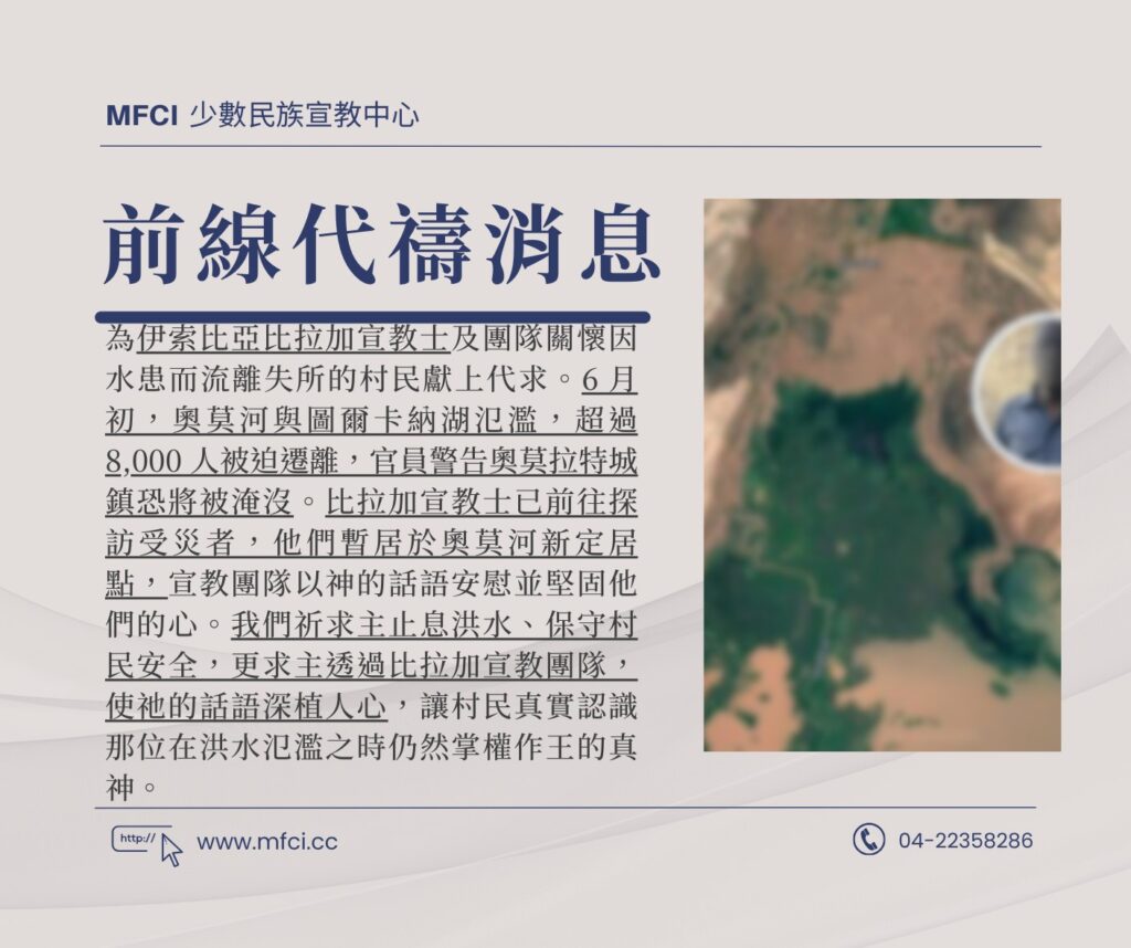 為伊索比亞比拉加宣教士及團隊關懷因水患而流離失所的村民獻上代求。6 月初,奧莫河與圖爾卡納湖氾濫,超過 8,0..