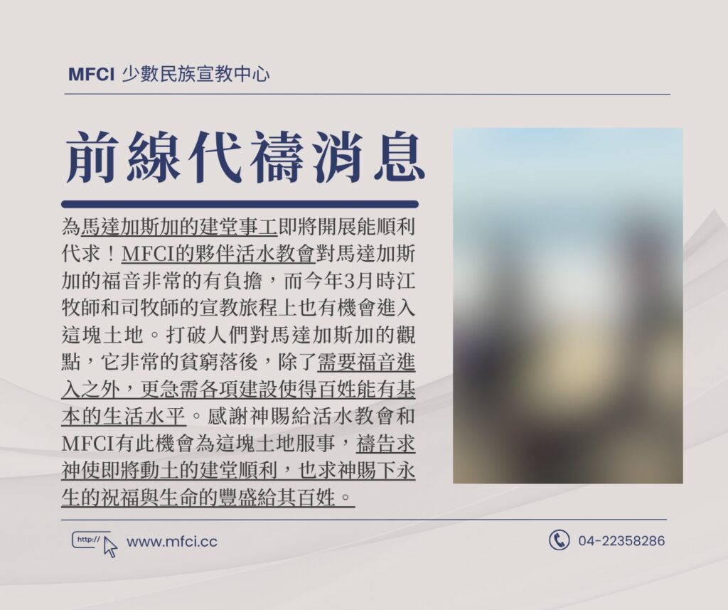 為馬達加斯加的建堂事工即將開展能順利代求!MFCI的夥伴活水教會對馬達加斯加的福音非常的有負擔,而今年3月時江..