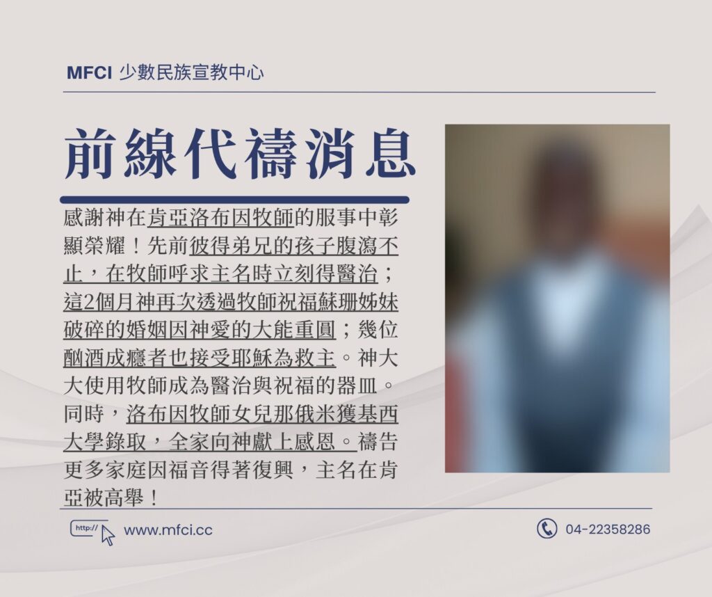 感謝神在肯亞洛布因牧師的服事中彰顯榮耀!先前彼得弟兄的孩子腹瀉不止,在牧師呼求主名時立刻得醫治;這2個月神再次..