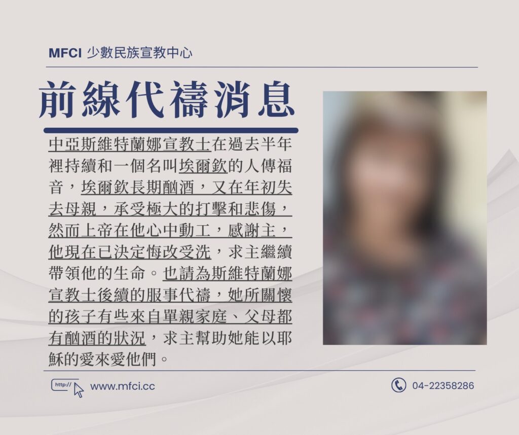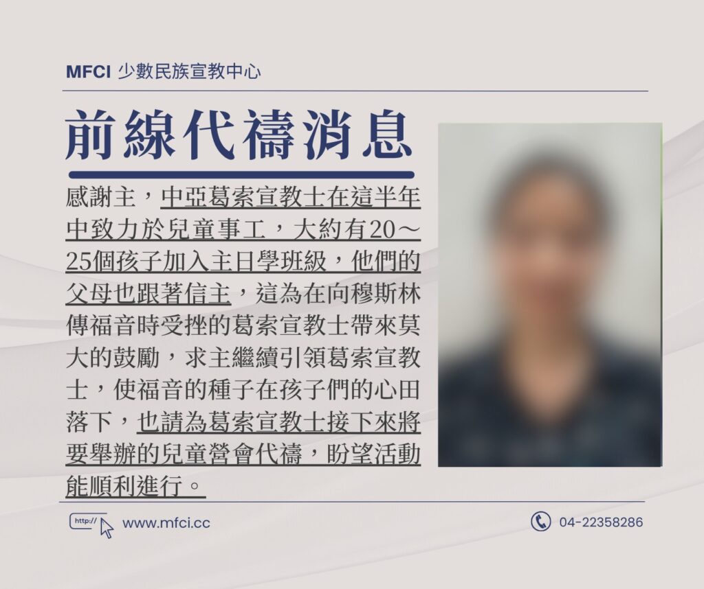 感謝主,中亞葛索宣教士在這半年中致力於兒童事工,大約有20~25個孩子加入主日學班級,他們的父母也跟著信主,這..