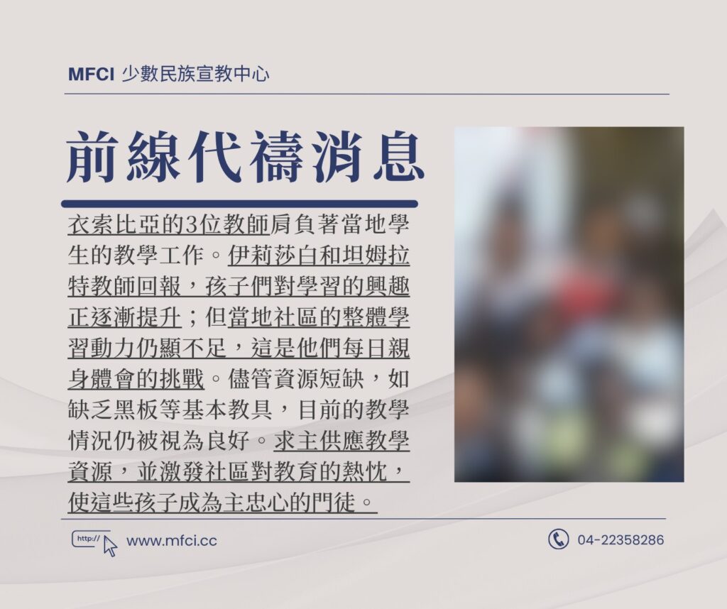 衣索比亞的3位教師肩負著當地學生的教學工作。伊莉莎白和坦姆拉特教師回報,孩子們對學習的興趣正逐漸提升;但當地社..