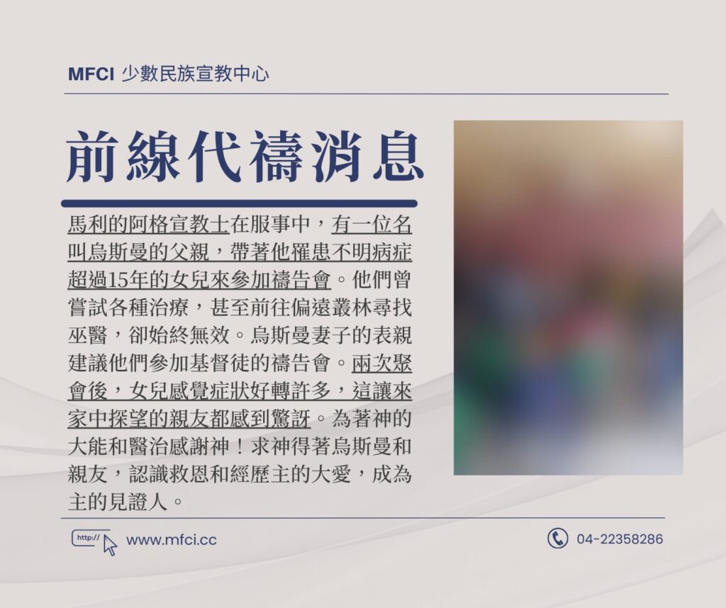 馬利的阿格宣教士在服事中,有一位名叫烏斯曼的父親,帶著他罹患不明病症超過15年的女兒來參加禱告會。他們曾嘗試各..